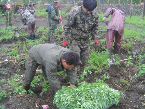 为营造我场绿化、美化环境,将场区四周及家属周边进行万寿菊栽植。下图为栽植万寿菊。